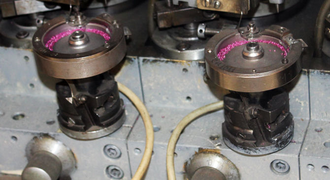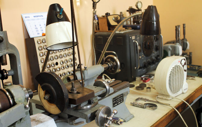 В цеху производства циферблатов из стальной заготовки рождается современный дизайн, придуманный художником. Всё делается с помощью простых механизмов и кропотливого труда рабочих.